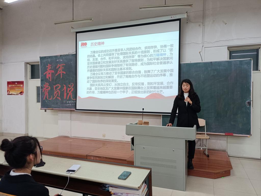 首先,郭雨同同学向我们介绍了在第二次世界大战结束后,在美苏之间日益加剧的冷战对峙局势之下,由于帝国主义对中间地带的夺取,亚非国家的独立与安全受到了严重威胁,越来越多的亚非国家意识到要发展经济与文化去维护政治独立,并选择与中国等社会主义国家建立和发展友好关系。1954年6月周恩来总理在中印和中缅两国总理会谈上提出“互相尊重领土主权,互不侵犯,互不干涉内政,平等互惠,和平共处”的五项原则作为处理国家关系的准则。大大促进了亚非各国之间团结合作,建立和发展友好关系。集中体现了中国主权,正义,民主,法治的价值观。