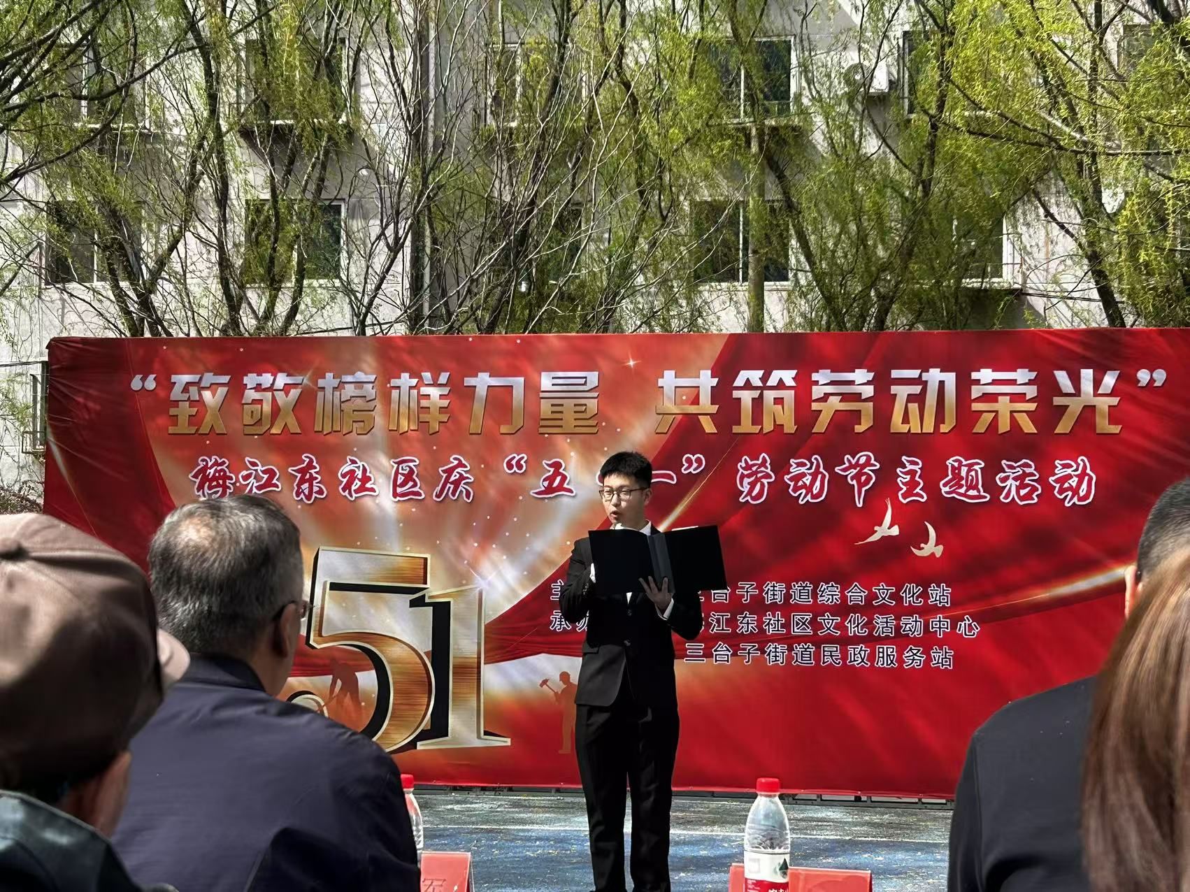 学生代表李萌面向台下社区劳动者代表发出青春宣言。他深情说道:"凌晨四点食堂揉面的双手、深夜实验室不灭的灯光、暴雨中坚守岗位的荧光背心……正是千万劳动者的微光,照亮了城市的晨曦。"他高举右拳带领全场青年宣誓:"传承劳动精神,勇担时代使命!"现场百余名观众自发起立鼓掌,许多老人眼含泪光与青年们齐声高呼"强国有我"。