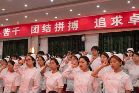 宣誓仪式拉开帷幕,护士们举起右拳庄严宣誓,在坚定的宣誓声中,所能感受到的是承诺,是责任,是坚守与未来。