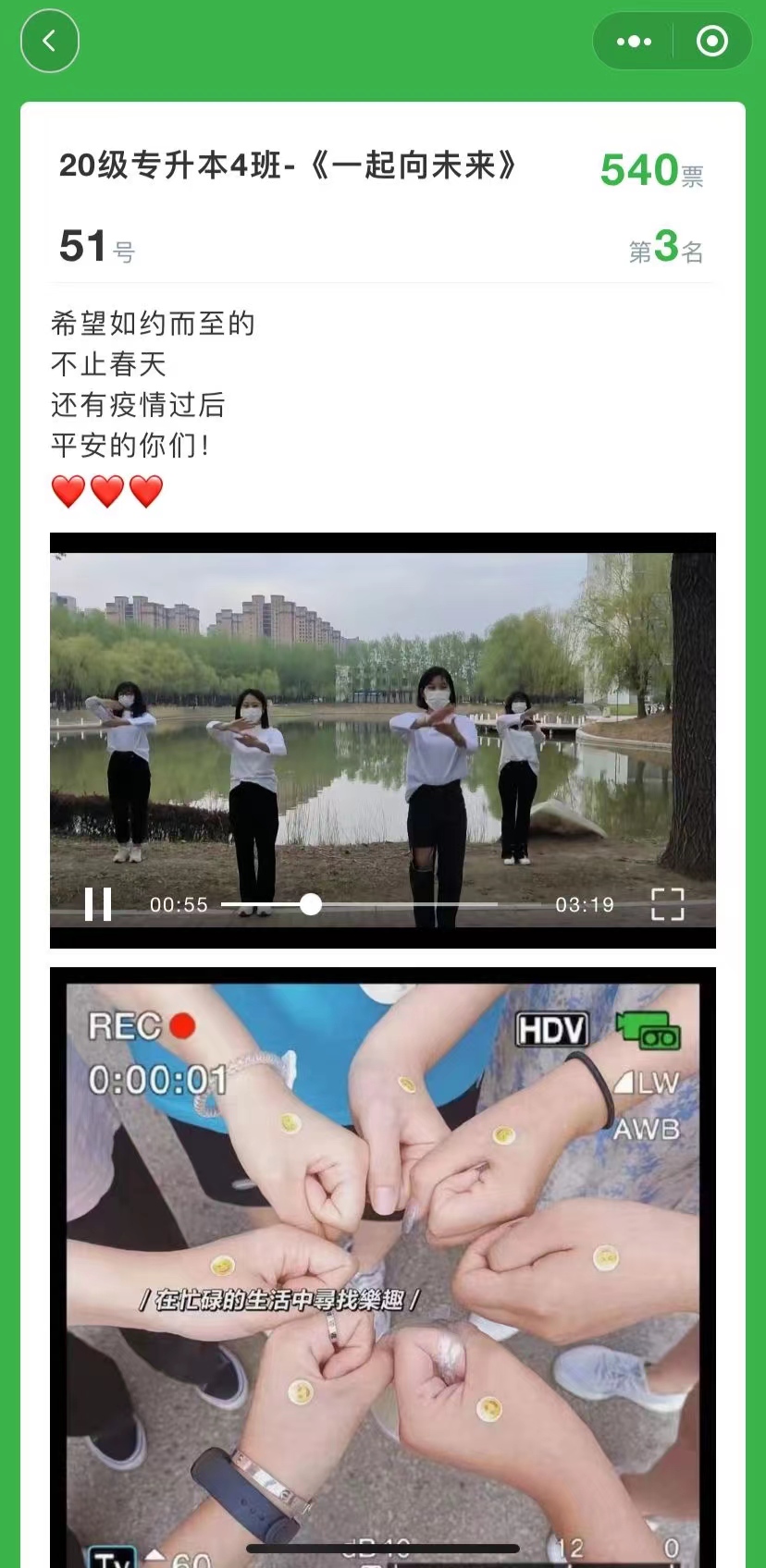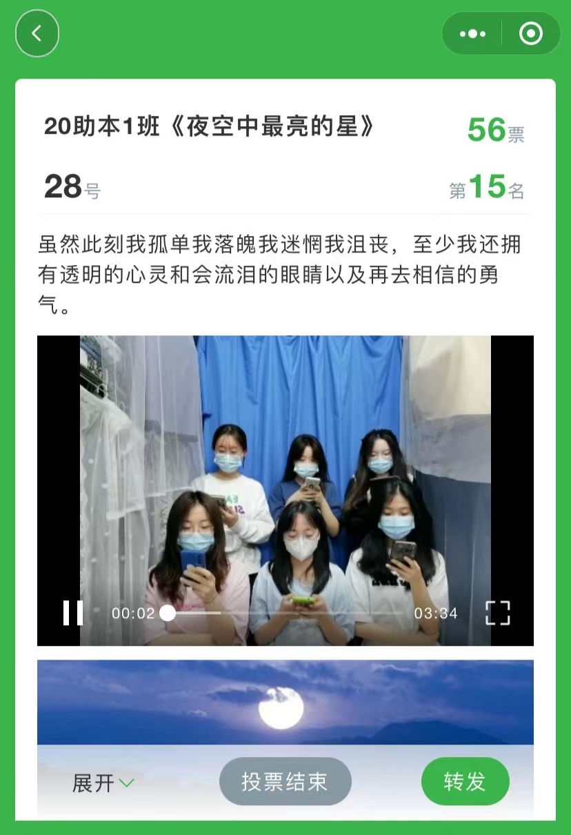 举办了以“以歌传达,抗疫之念”为主题的合唱比赛,共78名同学报名参加,累计投票数为2362票,达到了7291次浏览量。